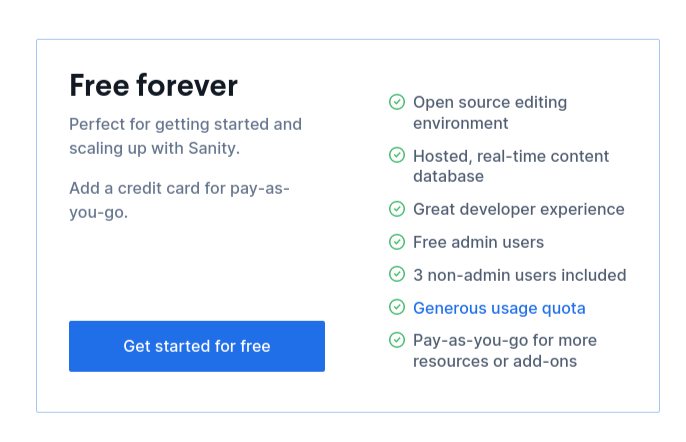 Sanity.io offers the pay-as-you-go plan with a free forever plan. The free forever plan, amongst other features, has an open-source editing environment hosted on their server and a real-time content database.